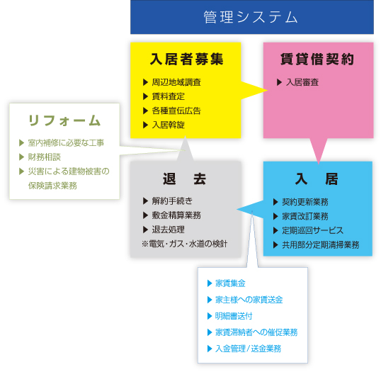賃貸の募集・契約・立会・家賃の回収・退去の手続き等の代行。